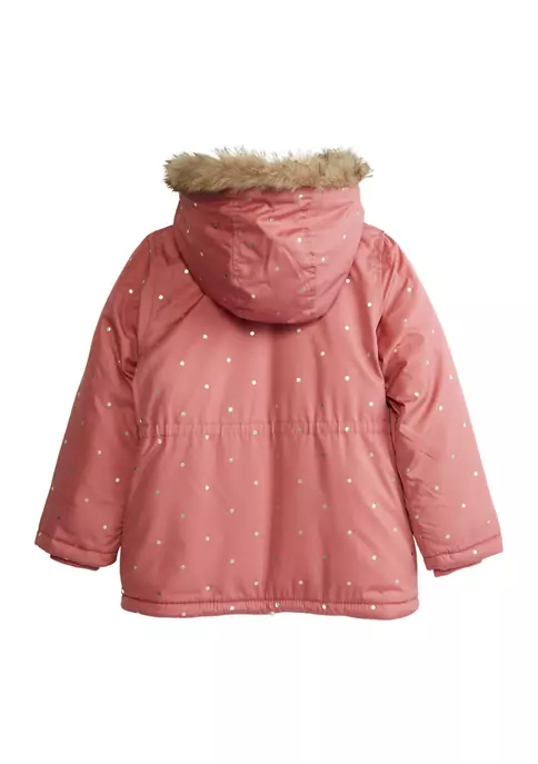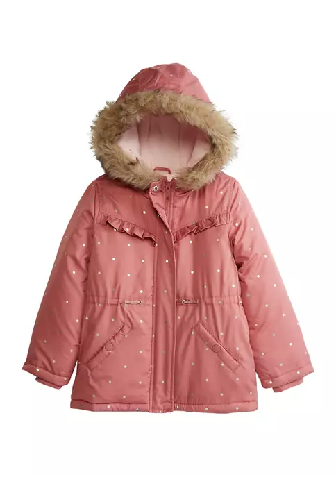 This heavyweight parka from Carter’sĀ® has an allover silver foil dot print, ruffle chest design, front zipper closure with placket, faux drawstring waist, rib knit cuffs, attached hood with faux fur trim, and two front welt pockets.