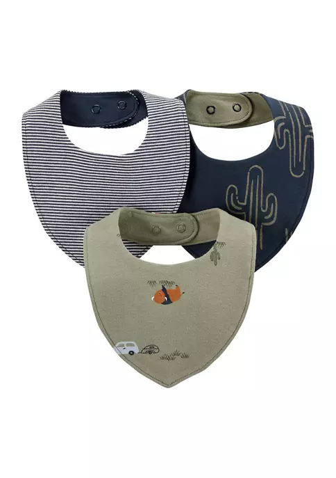 Fill up the diaper bag with these three adorable bandana bibs, complete with snap closures and water barriers.