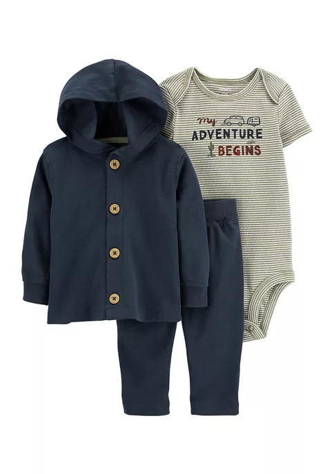 Crafted in soft cotton, this set is complete with a button-front cardigan, a short-sleeve bodysuit, and a pair of coordinating pants.