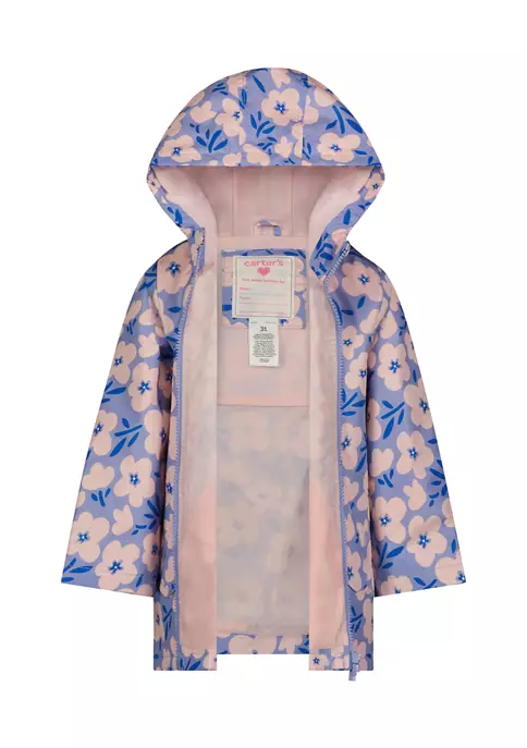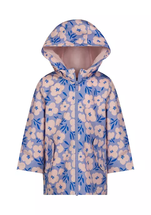 This rainslicker has an all-over print, an attached hood, front zipper closure, and two front pockets with logo snaps.