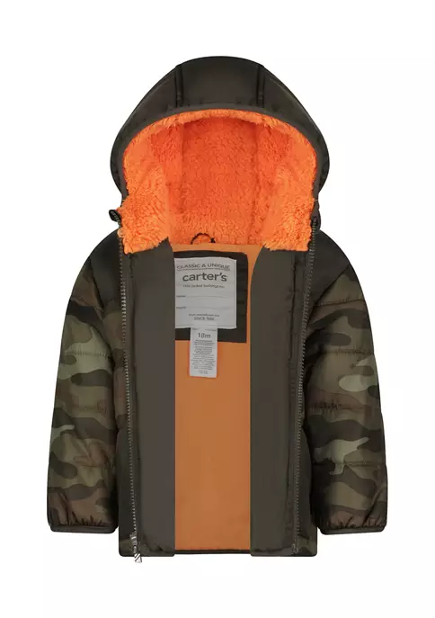 This Carter’sĀ® puffer jacket has a color block design, camo print, attached hood with sherpa lining, front zipper closure, and two front patch pockets.
