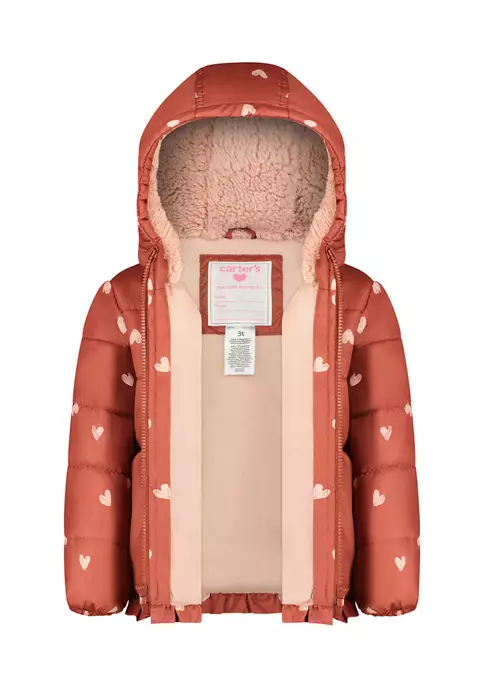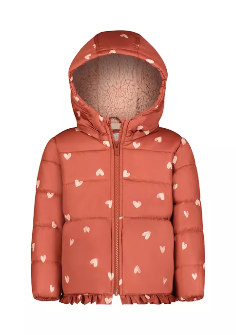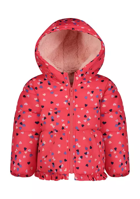 Puffer has an all-over print, a peplum design with ruffle trim, two side seam pockets, front zipper closure, and an attached hood with sherpa lining.