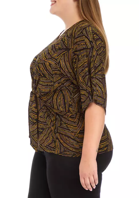 A chic foil print adds sophistication to this top from Kasper enhanced with a flattering tie front detail.