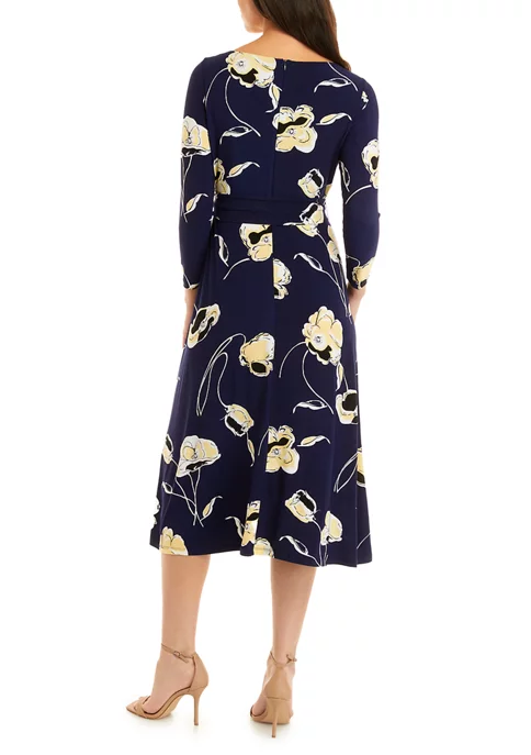 This workplace ready fit and flare dress features a feminine floral pattern.