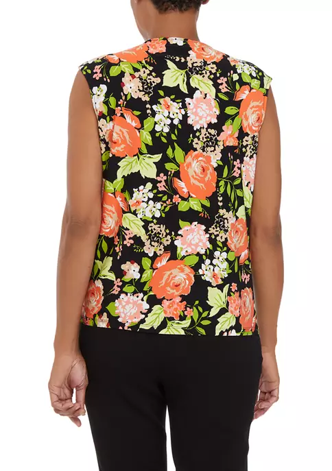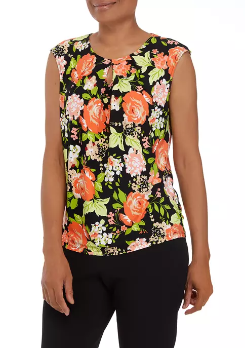 Bold roses burst on this cap-sleeved keyhole blouse from Kasper.