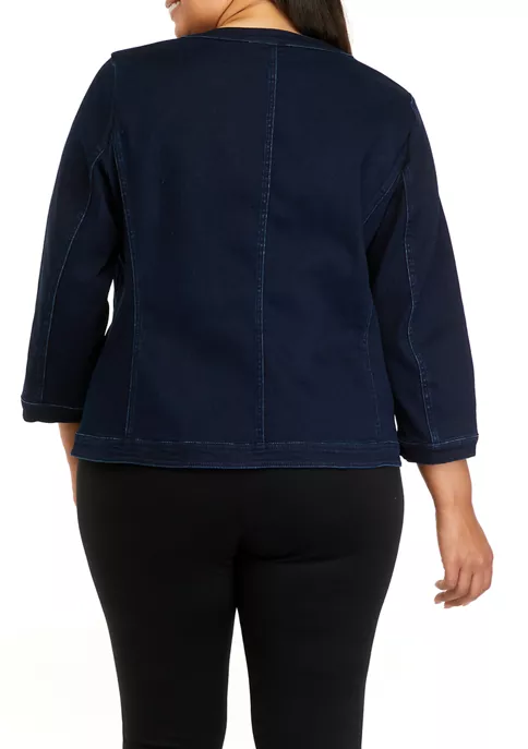 A blazer-style silhouette adds a professional spin to this denim jacket from Kasper.