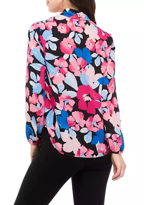 Bursting with vibrant floral blooms, this tie-neck blouse from Kasper is contemporary-chic on-the-clock or during cocktail conversations.
