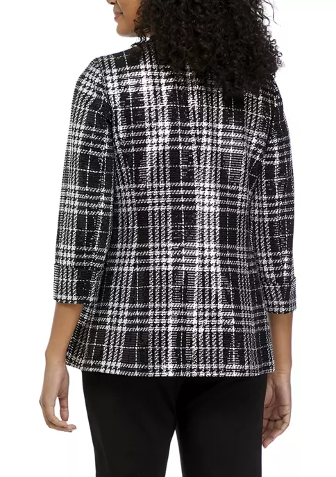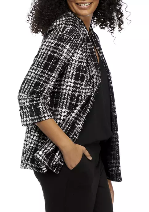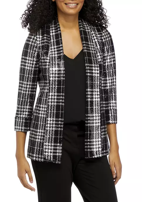 Roll-tab sleeves lend convenience to this blazer from Kasper that’s structured with a prominent metallic plaid print and shawl collar.
