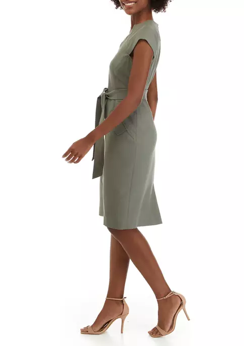 The curve-hugging sheath silhouette of this Kasper dress is accentuated by a belted waist and short cap sleeves.