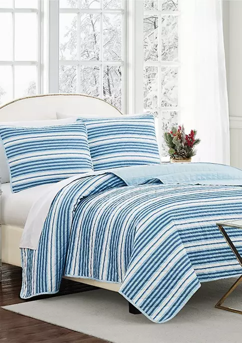 Spice up your bedroom with this beautiful Modern. Southern. Home.™ Quilt Set of Blue Stripes. This quilt reverses to a solid blue.