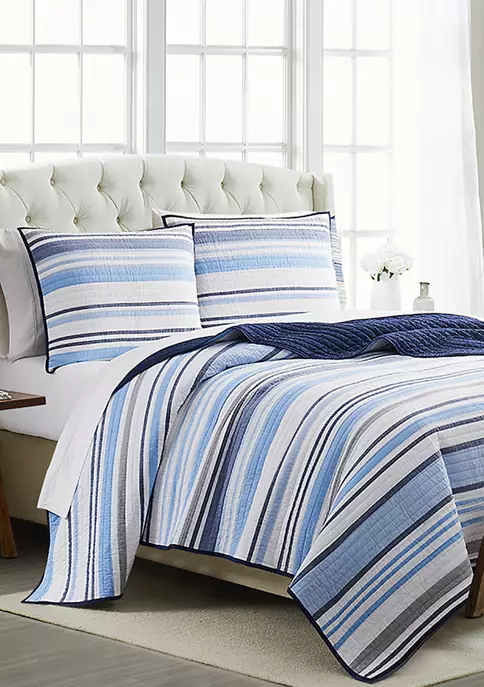 Perry Stripe Yarn-Dyed Quilt Set in blue, white, and grays, reversing to a solid navy blue.