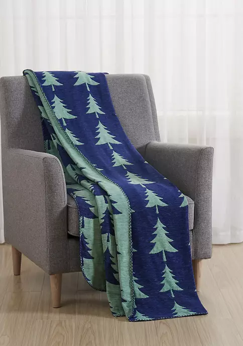 Decorate your home and nestle up with this beautiful cotton chenille throw blanket from Modern. Southern. Home.™ with a dark navy background and vibrant green holiday trees.