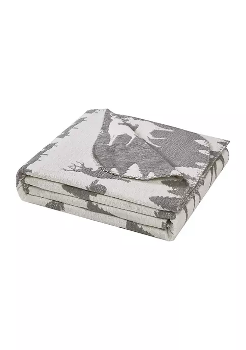 Decorate your home and nestle up with this beautiful cotton Chenille throw blanket from Modern. Southern. Home.™ with a white background and gray deer and trees throughout.